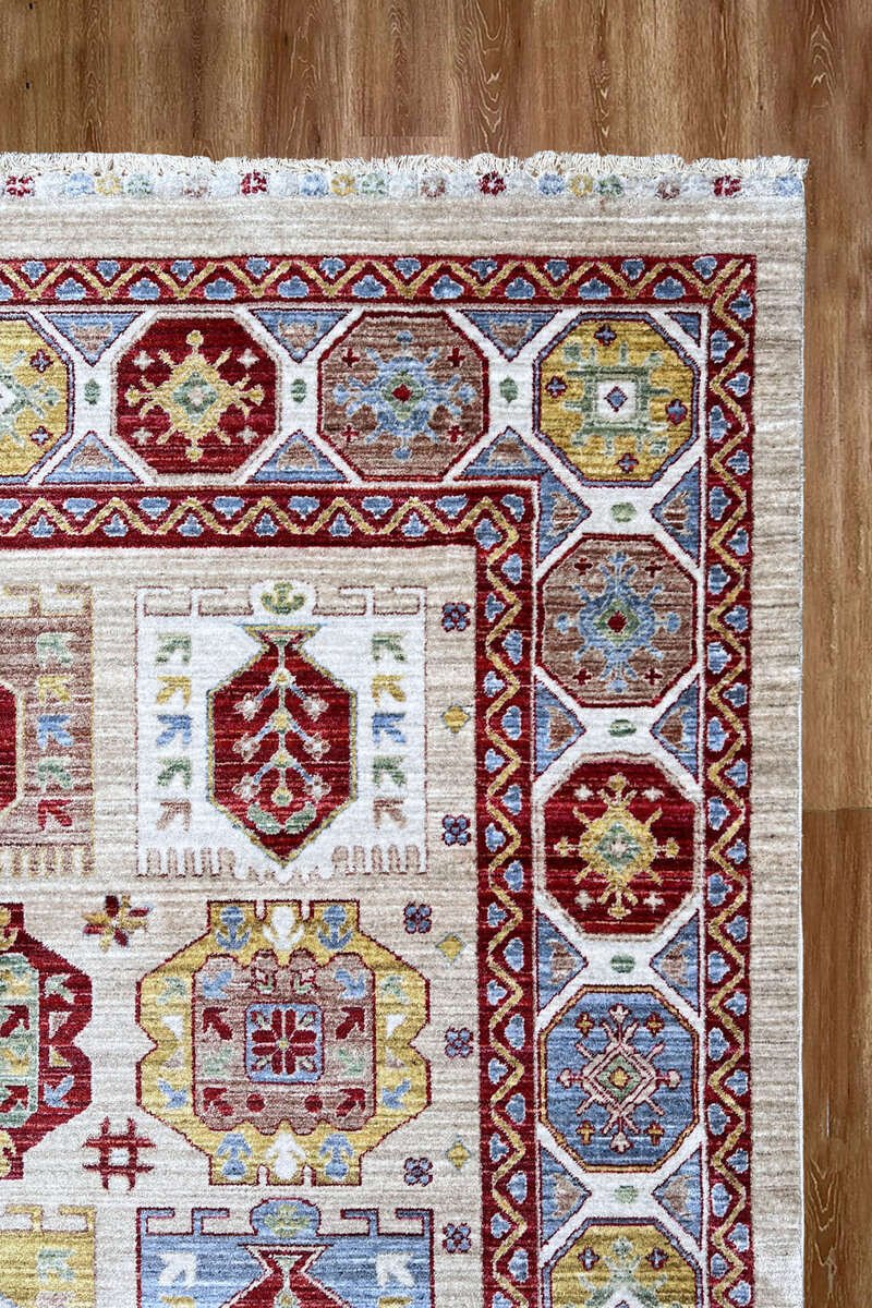 The Royal Kazak Rug is inspired by traditional tribal and oriental designs, crafted to bring warmth, luxury, and sophistication into your space. With detailed geometric patterns and rich color combinations, this rug makes a bold statement in any living room, bedroom, or drawing room.